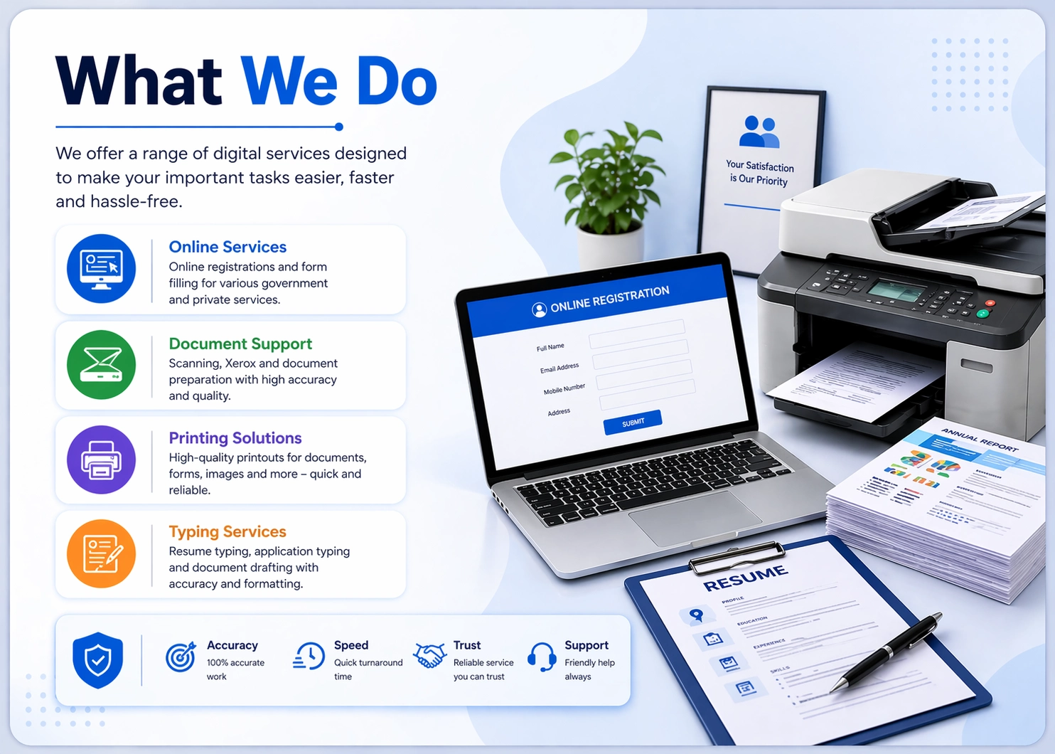 DHANVI ONLINE SERVICE is a trusted digital and e-service center dedicated to providing fast, accurate, and hassle-free government and online services. Our mission is to simplify complex processes and make essential services easily accessible to everyone.
